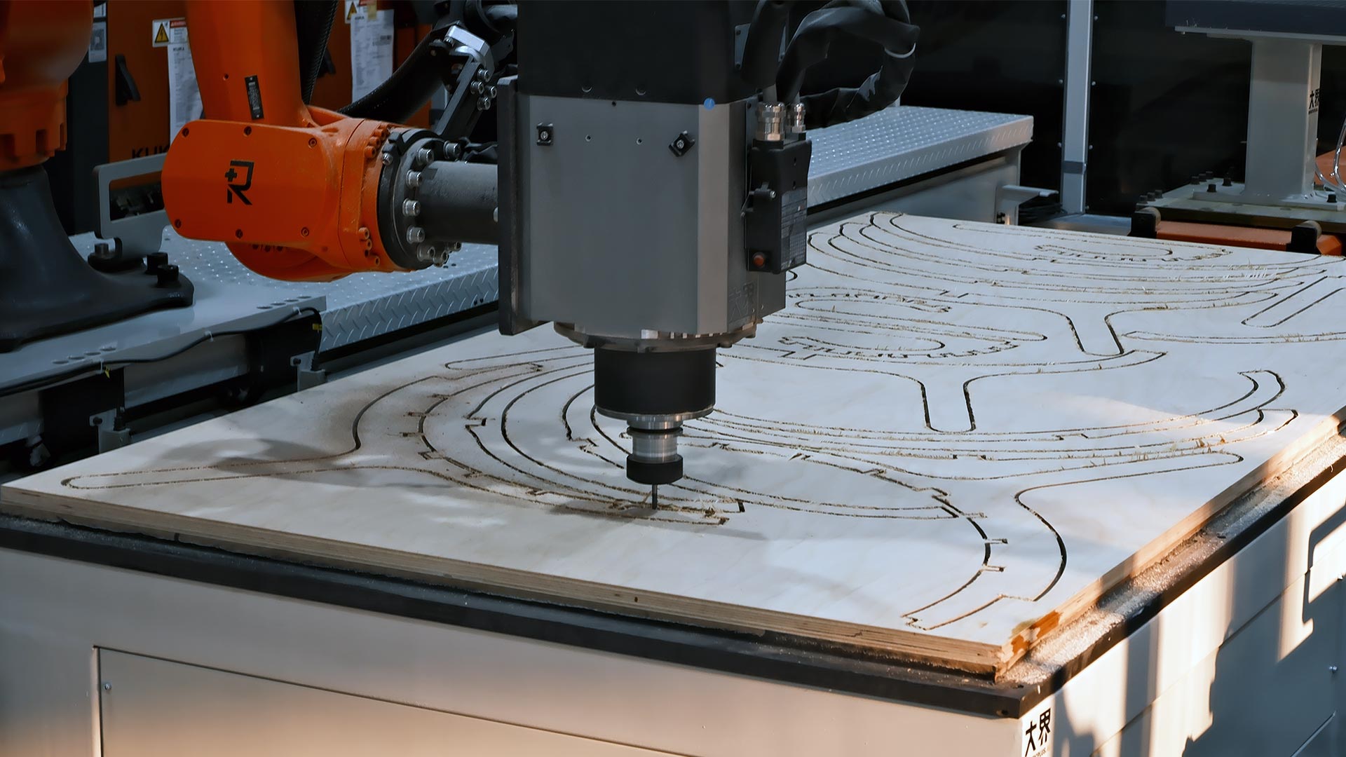 大负载型机械臂配置大界末端减材工具头、线性导轨、工装平台、刀具系统、教学控制平台等智能硬件系统,结合RoBIM软件,完成大型木构减材产品。